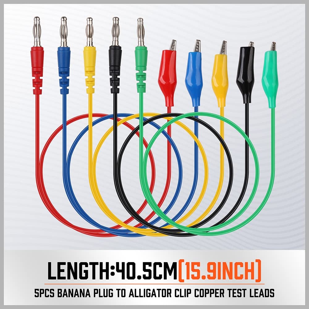 Flexible Silicone Test Leads: Five color-coded banana plug to alligator clip leads (15.9 inches long) offer easy connection and excellent reach into recessed or tricky spaces.